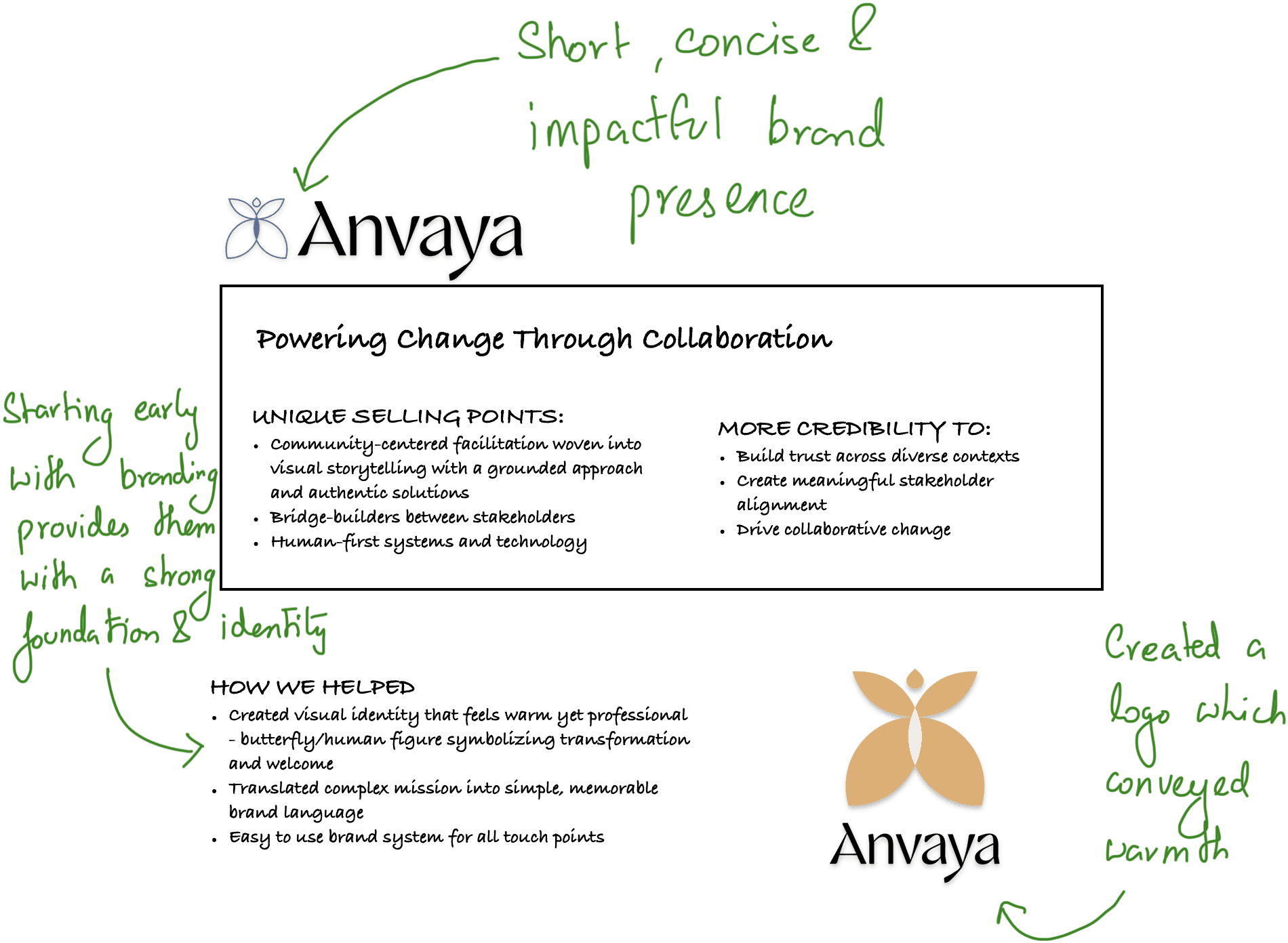 The design achieves something rare in the consulting space — it feels genuinely warm and human without sacrificing professional credibility. While most consulting firms default to cold corporate aesthetics and NGOs often feel overly soft, Anvaya's identity occupies a unique middle ground that's both approachable and authoritative.