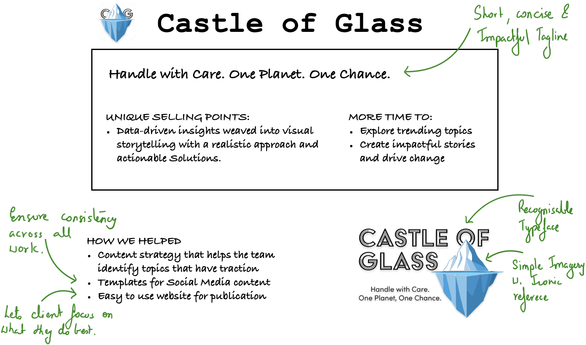 "Handle with Care. One Planet. One Chance." distills complex climate urgency into a memorable call to action. This tagline works across all touchpoints while leaving room for the brand to evolve.